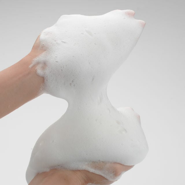 1. 泡立てネットなどを使用し、両手一杯になるくらいの沢山の泡を立てます。